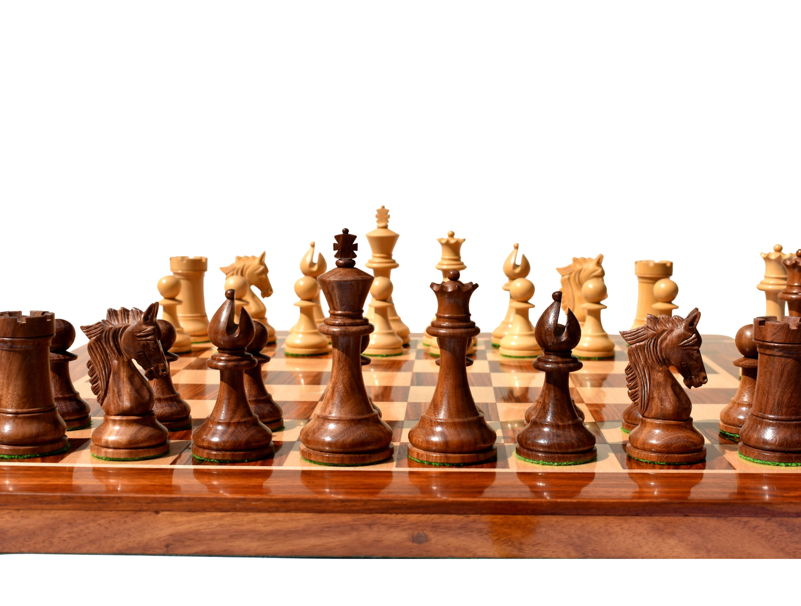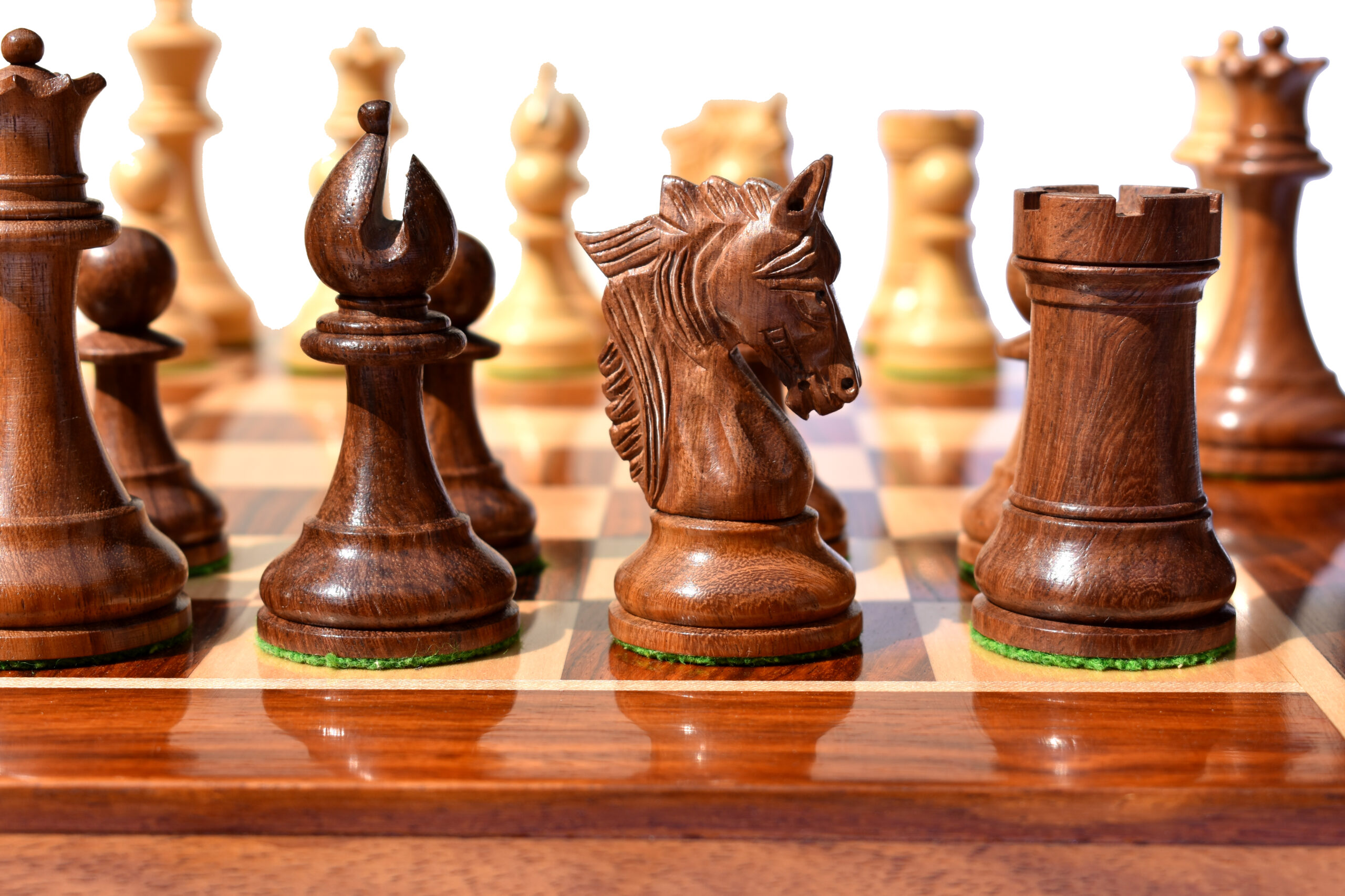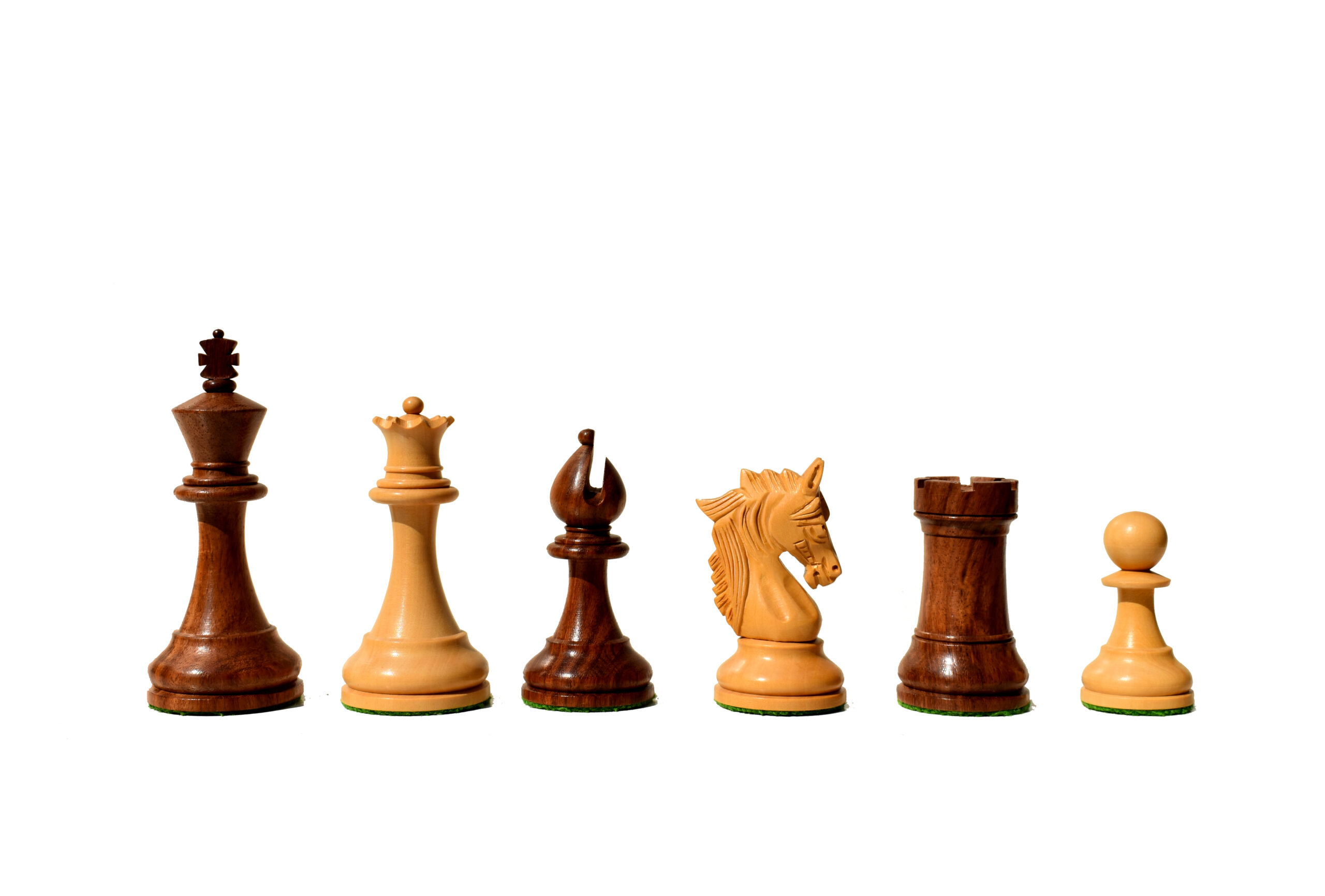 The stunningly carved king’s traditional finial and the proportionate queen’s shank with finely crafted coronets. The Bishop miter cut with the constant carving on the edges looks more extraordinary and unique bishop than any others.