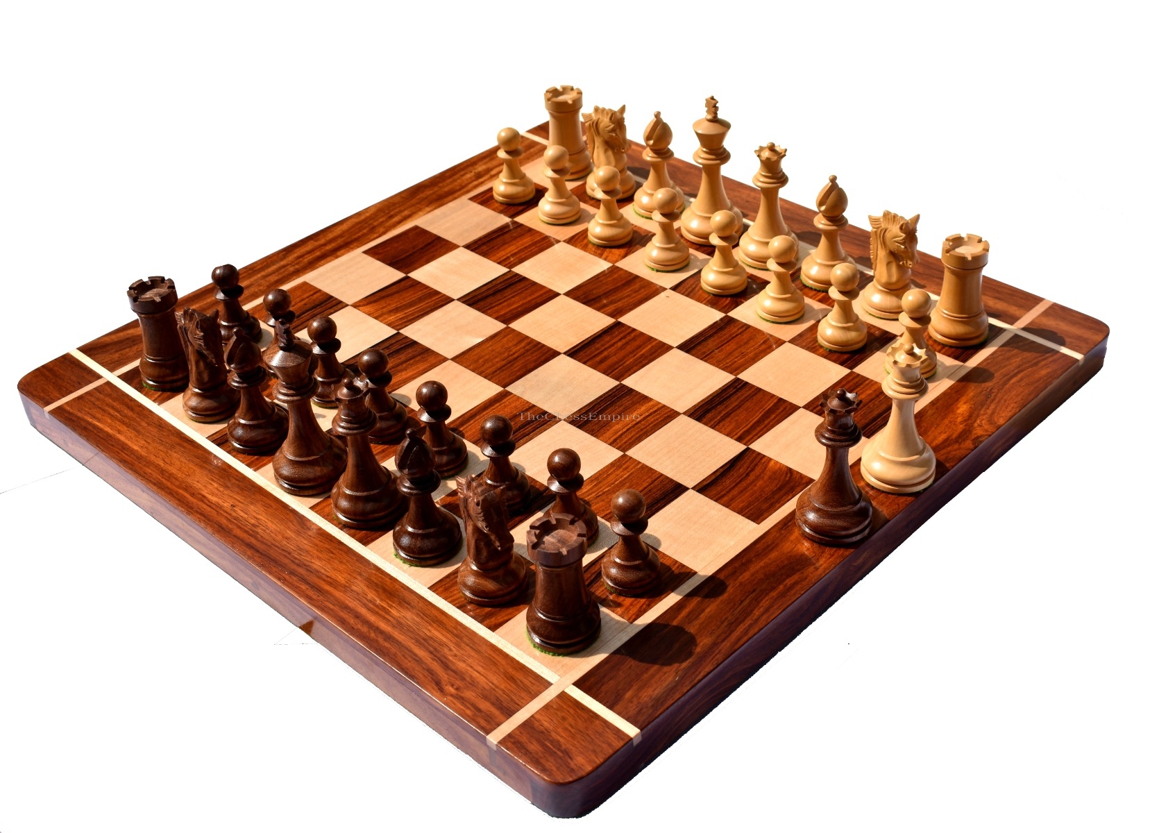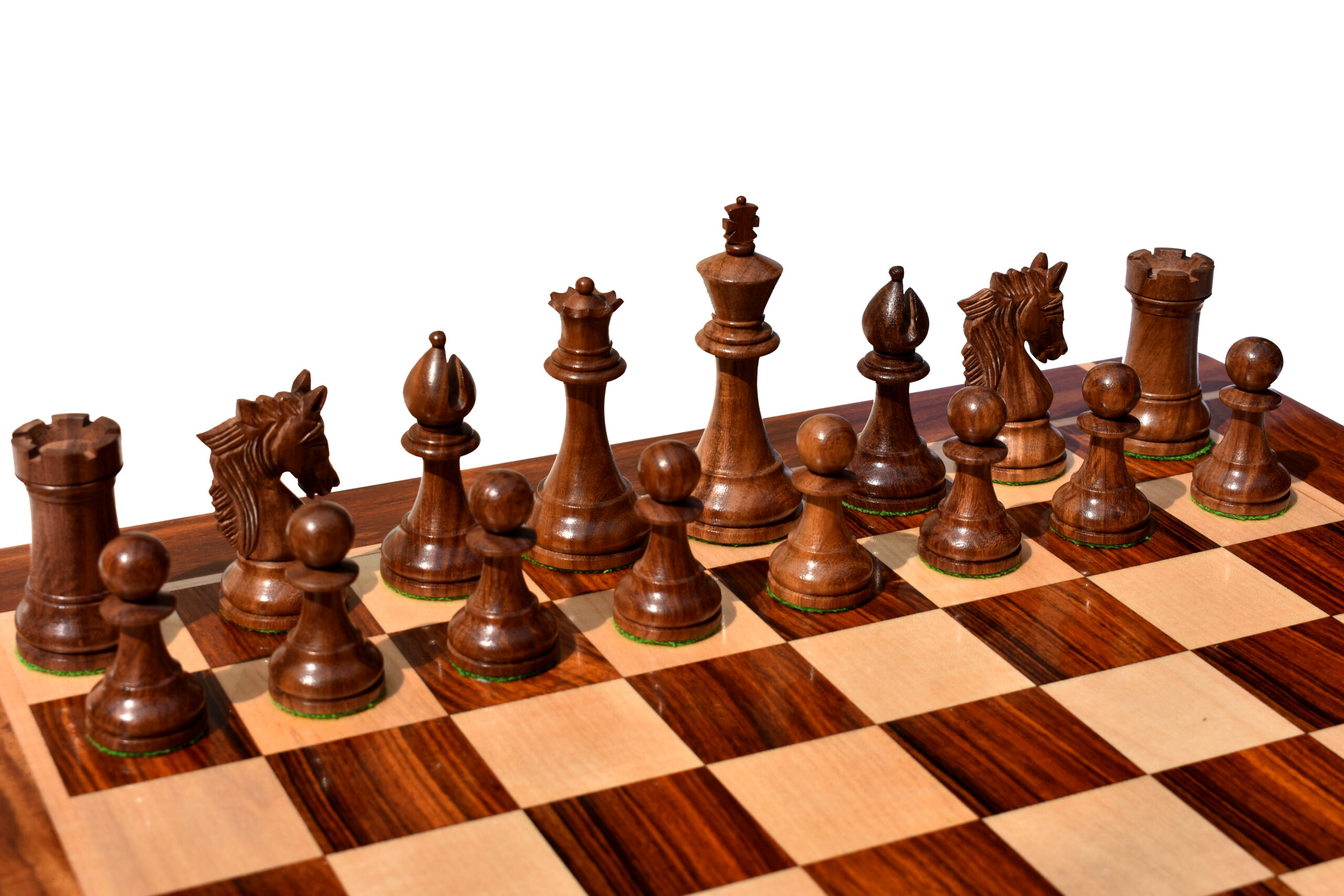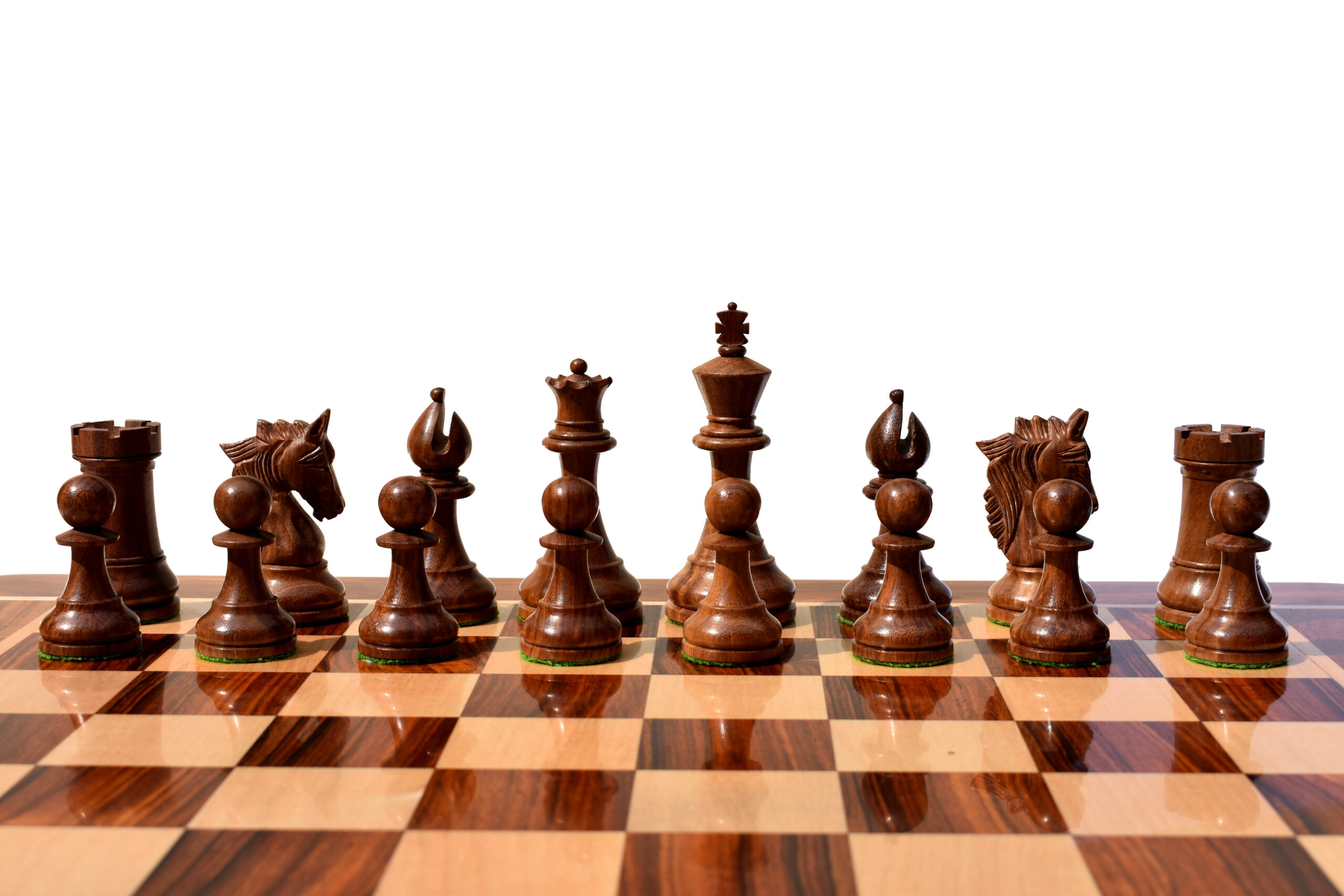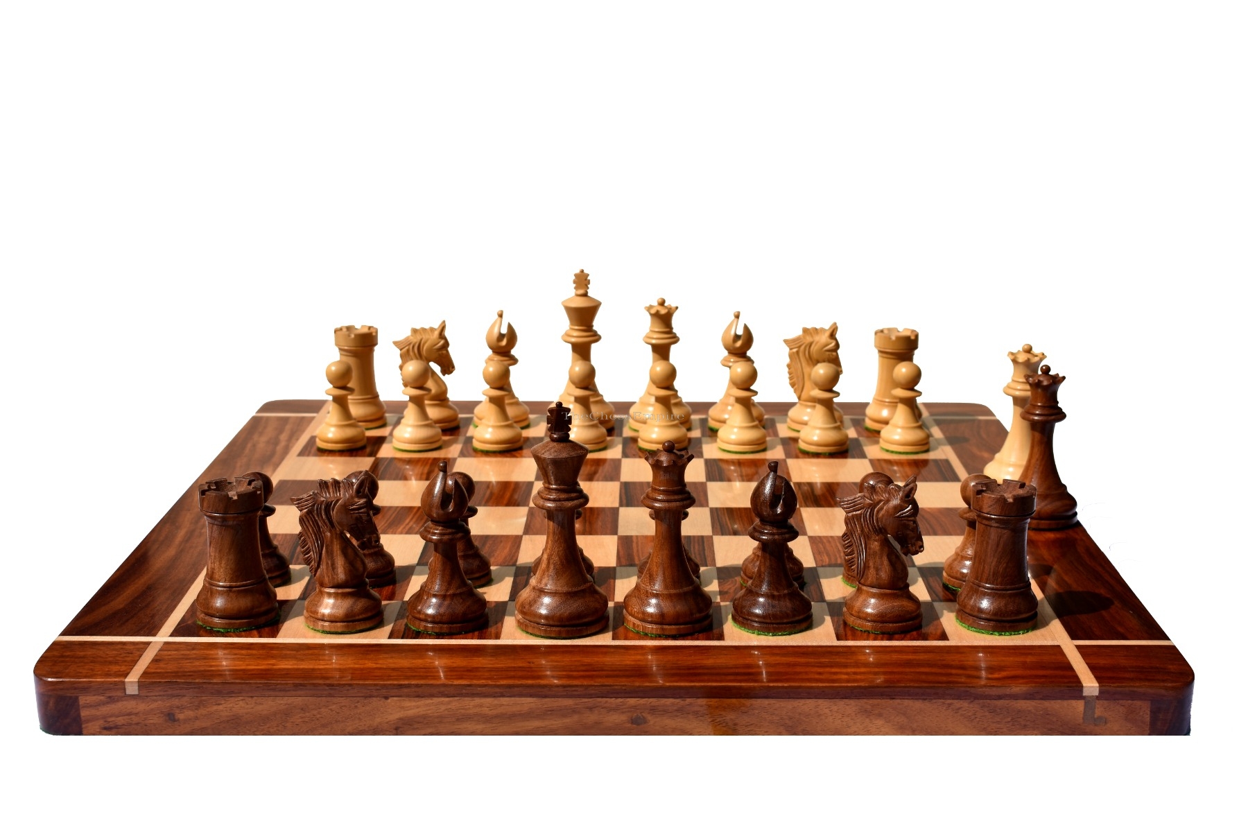 The stunningly carved king’s traditional finial and the proportionate queen’s shank with finely crafted coronets. The Bishop miter cut with the constant carving on the edges looks more extraordinary and unique bishop than any others.
