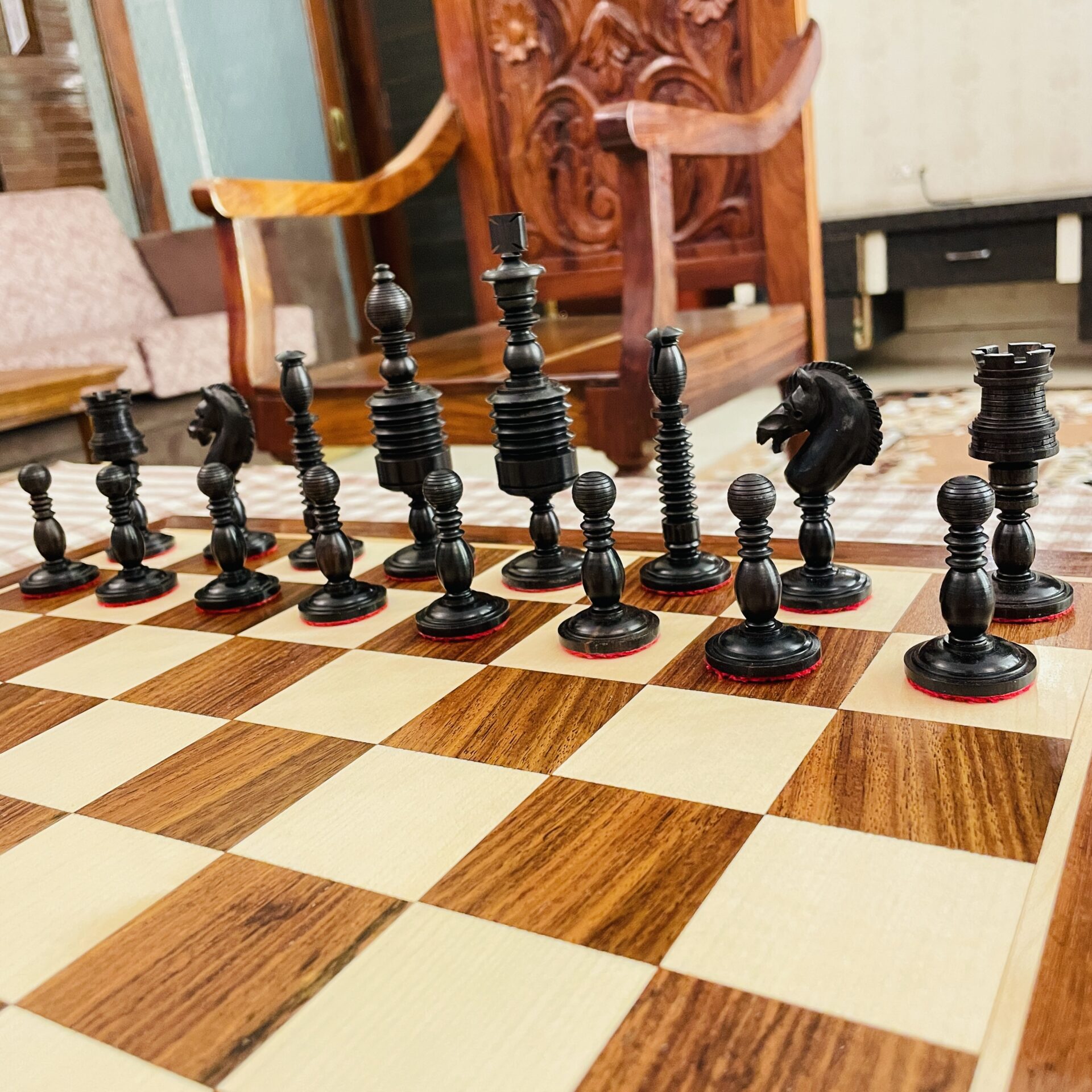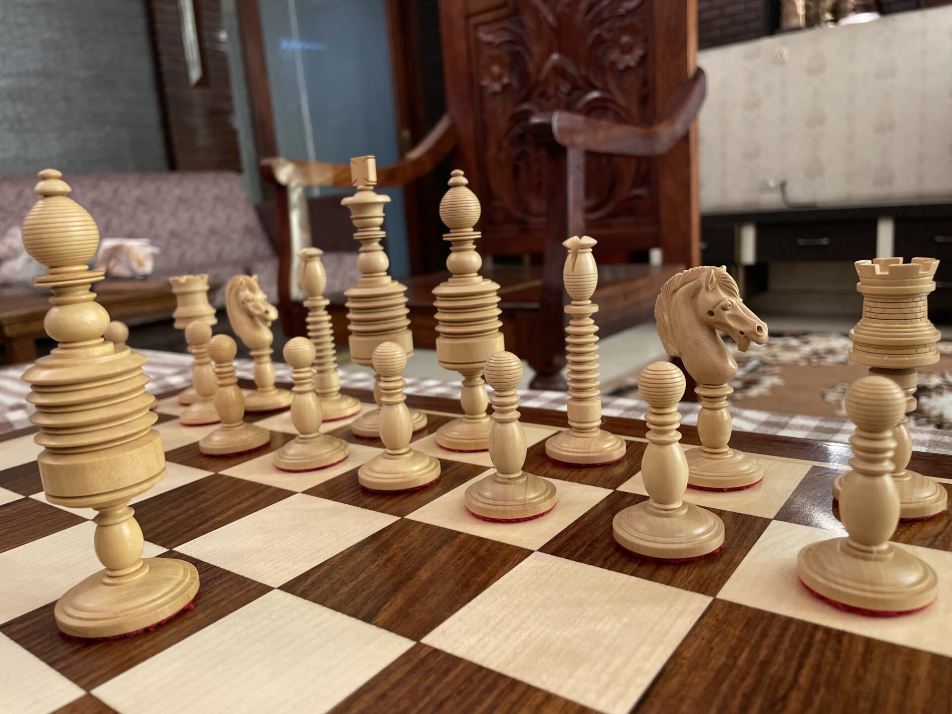 The Chess Pieces are hand carved by our skilled master craftsmen and crafted out of highest grade exotic woods with the luxurious billiard cloth base pads on it. The Chess set is un-weighted with the natural hand polish on individual chess piece for rich, long lasting shine and it also includes two extra queens.